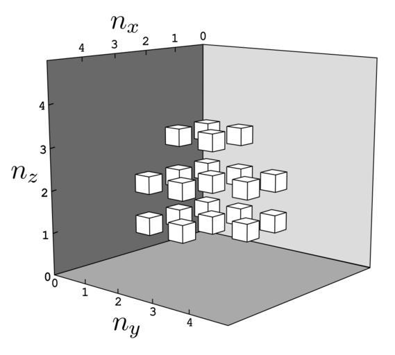 | Keywords: Aufbau Principle 3D (20 States).svg  A diagram of the state space of a 3D quantum well with the first 20 states by energy shown every state closer than 4 2 units to the origin self-made Inkscape Inductiveload Mathematica Code This code reuqire you to load the module << Graphics`Polyhedra` <pre><nowiki> a Table x y z x 1 5 y 1 5 z 1 5 ; a Flattena 2; a Select a Sqrt 1 2 + 2 2 + 3 2 < 4 2 ; Show Table PolyhedronCube an 0 3 n 0 Lengtha ViewPoint -> 3 5 3 1 Shading -> False PlotRange -> 0 5 0 5 0 5 Axes -> True </nowiki></pre> Aufbau principle 3D computer graphics |