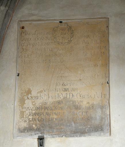 Keywords: Augsburg Domkreuzgang Nr061.jpg Augsburg Dom Kreuzgang Ostflügel 6 Joch Epitaph für Maria Christina ALexandrina Carolina Johanna Paulina von Ulm 30 Juni 1723 11 Oktober 1725 Tochter des Freiherrn Joseph Adam Ignaz von Ulm-Mittelbiberach und der Maria Johanna geb Gräfin von Grafenegg Inschrift mit Wappen Kosel Nr 61 own 2015-11 UliE1350 cc-0 Wall mounted church monuments in the cloister of Augsburg Cathedral 1725 works in Bavaria Reliefs of coats of arms in Augsburg Coats of arms of Ulm-Erbach-Mittelbiberach family |