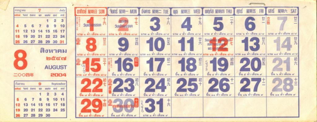 | Keywords: August2004rs.png Reduced size scan of generic Thai calendar page of type printed in bulk for stapling to an advertising poster which depicts August A D 2004/2547 B E the beginning of which corresponded with the beginning of the waning of the Thai Lunar Calendar leap month Moon 8/8 The copyright status of such a calendar page that cannot be attributed to any one source is unknown The scan itself commissioned by me is public domain See also Image Thai July 2008 0 png Title block Image July2008 1-2 jpg Dates 1-2 Image July2008 15-16 jpg Dates 15-16 Pawyilee 08 42 6 May 2008 UTC ๒๕๔๗ 2547 BE in Thai numerals 二㠇㠇四 2004 in Chinese numerals Pawyilee <span class signature-talk >talk</span> 02 25 28 June 2009 UTC 2007-02-19 own assumed Pawyilee August 2004 2547 Buddhist Era |
