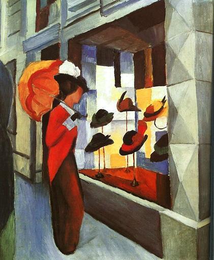 Keywords: August Macke Hutladen.jpg Artwork Creator August Macke 1914 oil on canvas cm 60 5 50 5 Institution Museum Folkwang Essen Germany accession number object history credit line uploader Rlbberlin Künstlergruppe »Der Blaue Reiter« own PD-old-auto 1914 1914 paintings in Germany Female headgear in art Shopping Paintings of women standing outdoors with parasols Oil paintings of women Red clothing female Paintings in the Museum Folkwang Red umbrellas in art Shop windows in art Milliners 1914 paintings by August Macke Watching in art Der Blaue Reiter |