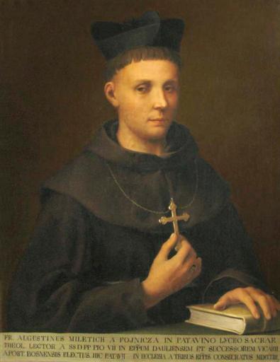 Keywords: Augustin Miletić2.png Uploaded with en wp UW marker 2015 07 06 Portrait of Bishop Augustin Miletić Fra Augustin Miletić 1763 - 1831 was a Franciscan friar and Apostolic Vicar from Bosnia and Herzegovina The portrait shows Bishop Miletić in half-figure against a dark background The bishop is wearing a habit with a black cap on his head and a gold cross around his neck which he is holding in his right hand He is holding a book in his left hand Original publication Unknown<br/> Immediate source http //www fojnica-samostan com/fojnicka_skrinja/Fojnicka_skrinja_broj_23 pdf 1803 more information about this portrait http //www kons gov ba/main php id_struct 50 lang 4 action view id 2496 author The original portrait of Bishop Miletić after which this portrait was painted dates from 1803 when Miletić was appointed as bishop The original was in the Franciscan monastery in Tolisa It is not known who painted the original portrait but Saitz is known to have painted this one after it Information acquired in the Franciscan monastery in Fojnica More about that from Bosnia and Herzegovina Commision to Preserve National Monuments Museum collection and Library holdings of the Franciscan monastery of the Holy Ghost the movable property http //www kons gov ba/main php id_struct 50 lang 4 action view id 2496 PD-old-70-1923 Franciscans in Bosnia and Herzegovina |
