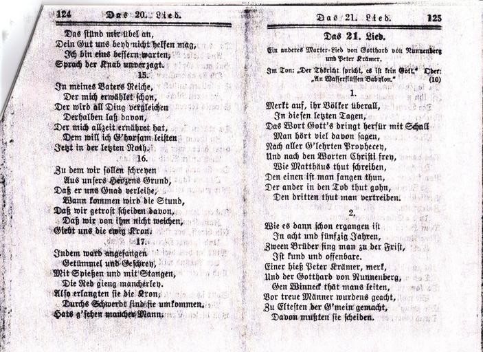 | Keywords: Ausbund 1977 3.jpg Ausbund das ist Etliche schöne Christliche Lieder 13 Auflage Verlag von den Amischen Gemeinden in Lancaster County Pa 1977 pp 120-124 no 20 scan from book 1529 anabaptist songwriter PD-old-100 Books about Schwäbisch Gmünd |