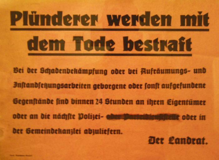 | Keywords: Aushang Plünderung.JPG  Aushang Plünderer werden mit dem Tode bestraft Bayern Nachkriegszeit Exponat bei der Sonderausstellung 60 Jahre Bayerische Polizei Ingolstadt Public warning Looters will receive the death sentence Bavaria post WW II own 2007-04-28 User Mattes Motif Amtliches Werk gem § 5 UrhG gemeinfrei PD-GermanGov de Bild Aushang Plünderung JPG Death penalty in Germany Looting Warning signs in Germany Sonderausstellung 60 Jahre Bayerische Polizei Taken with Nikon Coolpix L2 Work by Mattes 2007 User Mattes/Contributions/Topics/ Law enforcement and justice User Mattes/Contributions/Topics/banners coat of arms flags logos seals and signs User Mattes/Contributions/Topics/Germany/Ingolstadt |