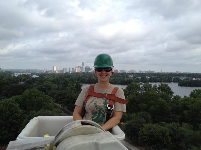 Keywords: Austin Parks Forester in the bucket truck. AustinUrbanForestry Urban Forestry