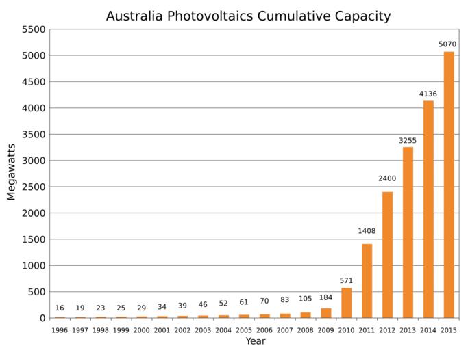 | Keywords: Australia Photovoltaics Installed Capacity.svg translate yes en Cumulative installed photovoltaics in Australia from 1996 to 2015 Sources 2014 http //www iea-pvps org/fileadmin/dam/public/report/technical/PVPS_report_-_A_Snapshot_of_Global_PV_-_1992-2014 pdf 2015 http //www iea-pvps org/fileadmin/dam/public/report/PICS/IEA-PVPS_-__A_Snapshot_of_Global_PV_-_1992-2015_-_Final_2_02 pdf 2014-12-01 own Delphi234 other versions cc-zero Solar energy in Australia Photovoltaic power statistics | ||||