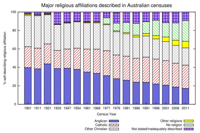 | Keywords: AustralianReligiousAffiliation 2.svg This is an attempt to replace the jpeg File AustralianReligiousAffiliationGraphWithoutTable jpg with a svg version Created by using gnuplot 4 4 patchlevel 0-rc1 it allowed me to modify font size of the key which the current stable release does not Script <pre> set terminal svg enhanced fname Helvetica fsize 10 size 600 500 set output AustralianReligiousAffiliation svg set style histogram rowstacked set boxwidth 7 absolute set style fill solid 1 0 border -1 set style data histograms set yrange 0 100 set ylabel self-describing religious affiliation set xlabel Census Year set key outside bottom right horizontal font Helvetica 8 set title Major religious affiliations described in Australian censuses font Helvetica 14 plot 'australia data-2' \ using 2 t Anglican fs pattern 2 lc rgb blue \ using 3 t Catholic fs pattern 5 lc rgb red \ using 4 t Other Christian fs pattern 1 lc rgb gray \ using 6 t Other religions fs solid lc rgb yellow \ using 7 t No religion fs pattern 4 lc rgb green \ using 8 xtic 1 t Not stated/inadequately described fs pattern 3 lc rgb purple </pre> Data was from own Erp talk created this work entirely by myself 1 2010-02-14 ; 2012 06 22 last version Erp talk / Erp wikipedia en 150px 150px Erp Original upload log en wikipedia AustralianReligiousAffiliation svg wikitable - 2012-06-22 03 46 600×400× 39166 bytes Erp <nowiki>Added the data for 2011 made slightly wider to fit</nowiki> - 2010-02-16 06 13 500×400× 37340 bytes Erp <nowiki>vertical size decreased</nowiki> - 2010-02-16 06 07 500×450× 37372 bytes Erp <nowiki>changed size slightly</nowiki> - 2010-02-15 17 57 600×500× 37450 bytes Erp <nowiki>resized in output of gnuplot</nowiki> - 2010-02-15 08 20 900×600× 78865 bytes Erp <nowiki>change to pattern and helvetic font</nowiki> - 2010-02-14 16 26 900×600× 61997 bytes Erp <nowiki>font size modification</nowiki> - 2010-02-14 15 53 900×600× 62069 bytes Erp <nowiki>modifying fonts</nowiki> - 2010-02-14 15 36 900×600× 61439 bytes Erp <nowiki> created from data provided by Yearbook Australia 2008 I ~~~ created this work entirely by myself ~~~~~ ~~~ File AustralianReligiousAffiliationG</nowiki> Demographics of Australia |