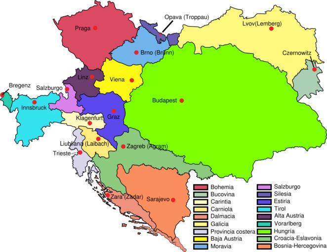 | Keywords: Austria-Hungary map with legend ES.svg <br><u>Austria “Hungary</u> <br>Empire of Austria Cisleithania 1 Bohemia 2 Bukovina 3 Carinthia 4 Carniola 5 Dalmatia 6 Galicia 7 KĂĽstenland 8 Lower Austria 9 Moravia 10 Salzburg 11 Silesia 12 Styria 13 Tyrol 14 Upper Austria 15 Vorarlberg;<br>Kingdom of Hungary Transleithania 16 Hungary proper 17 Croatia-Slavonia; <br>Austrian-Hungarian Co-dominion 18 Bosnia and Herzegovina <br><u>Ă–sterreich-Ungarn 1910</u> <br>Cisleithanien 1 Böhmen 2 Bukowina 3 Kärnten 4 Krain 5 Dalmatien 6 Galizien 7 KĂĽstenland 8 Ă–sterreich unter der Enns 9 Mähren 10 Salzburg 11 Schlesien 12 Steiermark 13 Tirol 14 Ă–sterreich ob der Enns 15 Vorarlberg;<br>Transleithanien 16 Ungarn 17 Kroatien und Slawonien; 18 Bosnien und Herzegowina <br><u>Austria “HungrĂa</u> <br>Imperio Austriaco Cisleitania 1 Bohemia 2 Bucovina 3 Carintia 4 Carniola 5 Dalmacia 6 Galicia 7 Provincia costera 8 Baja Austria 9 Moravia 10 Salzburgo 11 Silesia 12 Estiria 13 Tirol 14 Alta Austria 15 Vorarlberg;<br> Reino de HungrĂa Transleitania 16 HungrĂa 17 Croacia-Eslavonia; <br>Condomio austro-magiar 18 Bosnia y Hercegovina Austria-Hungary_map_new svg 2010-02-11 17 30 UTC Austria-Hungary_map_new svg Austria-Hungary_map svg IMeowbot derivative work Rowanwindwhistler <span class signature-talk >talk</span> Spanish version in svg New legend and colours rowanwindwhistler Austria-Hungary_map_new svg PD-user-w original upload log This image is a derivative work of the following images File Austria-Hungary_map_new svg licensed with PD-user-w 2009-02-20T12 28 19Z Ivh123 783x605 250731 Bytes <nowiki> Austria “Hungary Empire of Austria Cisleithania 1 Bohemia 2 Bukovina 3 Carinthia 4 Carniola 5 Dalmatia 6 Galicia 7 KĂĽstenland 8 Lower Austria 9 Moravia 10 S</nowiki> Uploaded with derivativeFX Maps of Austria-Hungary |