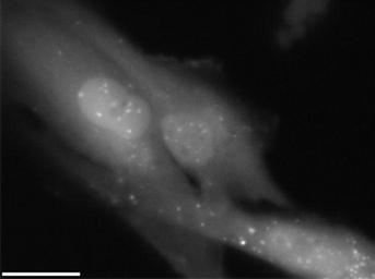 Keywords: Autophagosomes.jpg en Autophagosomes labeled with a fluorescent marker own Genericuser 2009 This is an image of the autophagosome marker GFP-LC3 in live human tissue culture cells hTERT-RPE1 incubated for 1 hour in nutrient deprived media The bar represents 20 microns Check categories 2010 September 5 en wikipedia Autophagy_ cellular 3 Signal transduction Death Cell biology |