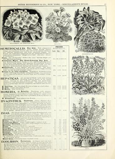 Keywords: Autumn bulbs catalogue (15831877393).jpg PETER HENDERSON CO NKW YORK -MISCELLANEOUS BT'LBS <br> lltLLEUOltl <br> HEMEROCALLIS J ; <br> Very ornament iil <br> lilnntw linvini; clcuniit <br> foliuK 'I'i'l liauiiHoiMi flnwiTK tlii\v fi pf iif t ho caslcHt oiiltui'i' In <br> any irilluary Ranlen snll ami form ii iniiralile cliimpH The <br> lluwei-H arc Hninewhat cylienu'inl Imt arc produced mieeensivel v <br> anil in j;reat abundance Height 2 to 3 feet See cut Ileiidy <br> III \o vein lilT I <br> Flava The old favorite Yellow Dny Lily flowers bright yel- <br> low delli-ately perdimcd <br> Atirantiaca Major The Giant-floweringr Day Iiily \ <br> new Henierocallis from lapan; a very vigorous-trowirig pianl <br> with liroad long foliage and immense liroad-petaled trumpet <br> liiy-llke tiowerH J inclies aiross of a deep orange 'oior and very <br> fragrant ; it llowers frwly during late summer and autumn <br> Middendorfii A very distinct and rare variety The plant <br> makes a dwarf compact liusli only about one ftxit high bearing <br> large lily-Uke flowers of liriglit yellow <br> Kwanso fl pi folia varie fata Magnificent double-liowering <br> variety witli large beautifully variegated foliage very ornament- <br> al even when not in bloom; flowers large and of reddish orange <br> See cut <br> 150 1 50 10 00 <br> i-iprjAnri/ A Are among our finest ardy early sprlng- <br> llC rr\ 1 IV'/A flowering bulbous plants of the easiest <br> culture thriving in any ordinary garden but particiiliirly <br> ailapted to wild semi-shaded situations The plants form tufts <br> about 1 Inches high aiul are comi letely smothered with UowerB <br> Seeriil l <br> H Angulosa Sky blue single flowers as large as a half dollar <br> H Alba Large jnire white llowei-s <br> H Ktibra Itosy red flowers <br> HOMERIA <br> 30e <br> 20c <br> or Bobartia Handsome early sumnier- <br> tldwering bulbs not quite h -irdy in nortliern <br> stales ; adnjited fi r ot culture bi Irames during tin' winter or or 1 <br> pliintiiignut in sjjring; they bear a profusion of showy flowers on i <br> stems 1 fool Idgh I <br> H Aurantiaca Deep salmon rose flowers <br> HYACINTHUS <br> Candicans CUnnt Surnnior Hyn- <br> rintln Luxuriant fre »-growing sum- <br> nu'r-llowcrlng plant spreading L' to feet throwing up great <br> tall spikes 4 to feet i i height each beiiring 'JO to 'iO large white <br> bell-shupcd tlowers; of easiest c\illure and splendid f jr groups <br> II pbinled In the centre of beds of scnrh't iladioiussuchas ISrench- <br> leyensls the effect is magidfuent Keep the bulbs dry and plant <br> out In spring Iteiiily in Xu lew her <br> I yi A C The Ixia Is a beautiful little win tcr-flowering bulb with <br> l i' low slender graceful spiki'S of bloom The colors aip <br> rich varied and beaulifid the cenlrealwaysdiffering in color from <br> the ollnr jiarts of the flower so that tlie blossoms e \pandliig In <br> the sun's rays jiresent a picture of gorgeous beauty <br> Admiration Cn'am rfdeye; outside streaked purple <br> Brutus VillciH l irge dark eye <br> Crateroides Major Larue bright scai-let ; earliest of ail <br> Duchess of Edinburg run-white stripes l rlght rose black eye <br> Maculosa Ucnniifui pure pink <br> Nitens Kldi crirnsnii black eye; splendid <br> Pretiosus Very large clear white rich crlmscin eye <br> Bosea Plena i \\'uiiilrr \ Double rose fragrant <br> Sarniensis fl pi Di-mble white striped 'jink <br> Stinbeani i ir 'inge striped wiili crimson <br> Viridiflora I'ure gn-en with blm k eye <br> White Swan P\ire wliite with indigo eye <br> The I'dllccilnri of above iL' named Ixlos 1 bulb euch Siic; 8 each <br> l M ' -i i; C'lch - f oo <br> Mixed Ixias containing many exi ulslte sorts <br> IVir I IDIOM Tartaricum \n elegant und rare hnlf- <br> I/VlV/L ltV'V71 hardy bulbous i lMnt of fr -e growth and <br> producing grand spiki-s 1 feet high of splemlld bell-shaped star- <br> like llowcrs of rich purple shaded with sk v blue It blooms natur- <br> ally in summer and the bidbscin be kept dry anil planted out <br> In spring or tliey may be grown In pots In cold frumi's and be <br> brought lu the conservatory towards spring for blooming <br> 3 00 20 00 <br> 2 00 12 00 <br> 30c ; 5 00 20 00 <br> 20c <br> 15c <br> 15c <br> 2 00 12 00 <br> 1 50 10 00 <br> 1 50 10 00 <br> 50 3 00' <br> 8c <br> – Ac <br> 7c <br> id <br> l - c l <br> Oc i <br> 6e l <br> 5c <br> 2 - c <br> no' <br> 50 <br> 30 <br> GO' <br> 7 5 <br> iO <br> 1 50 <br> » » <br> iO <br> 50 <br> 2 50 <br> 50 <br> 4 00 <br> 4 00 <br> 3 00 <br> 2 00 <br> 4 00 <br> 5 00 <br> 4 0 i <br> 10 oo <br> 4 00 <br> 4 00 <br> 3 00 <br> 3 00 43899747 149965 78524 Page 35 Text http //www biodiversitylibrary org/page/43899747 1900 10 5962/bhl title 78524 Henry G Gilbert Nursery and Seed Trade Catalog Collection ; Peter Henderson Co NameFound Angulosa NameConfirmed Angulosa NameBankID 5333141 NameFound Aurantiaca NameFound Bobartia NameConfirmed Bobartia EOLID 5870257 NameBankID 1860017 NameFound Bosea NameConfirmed Bosea EOLID 2877689 NameBankID 2554523 NameFound Brutus NameFound Hemerocallis NameConfirmed Hemerocallis EOLID 11375972 NameBankID 2662577 NameFound Homeria NameConfirmed Homeria EOLID 5871222 NameBankID 1860012 NameFound Hyacinthus NameConfirmed Hyacinthus L EOLID 33211 NameFound Ixias NameConfirmed Ixias EOLID 20134 NameBankID 3002058 NameFound Kldi crirnsnii NameFound Maculosa NameConfirmed Maculosa NameBankID 5332904 NameFound NITENS NameConfirmed Nitens NameBankID 5129617 NameFound Pretiosus NameFound Sarniensis fl NameFound Tartaricum NameFound Viridiflora Biodiversity Heritage Library Autumn bulbs catalogue 1900 Garden Stories Bulbs Plants Catalogs Flowers Gardening Seeds Trade catalogues U S Department of Agriculture National Agricultural Library bhl page 43899747 dc identifier http //biodiversitylibrary org/page/43899747 Peter Henderson Co bhlGardenStories Hemerocallis Hepaticas Ixias BHLinbloom bulbs plants u s department of agriculture national agricultural libr