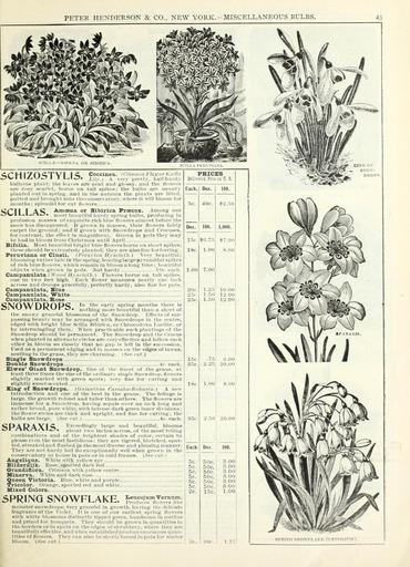 Keywords: Autumn bulbs catalogue (16264538530).jpg PETER HENDERSON CO NEW YORK - MISCELLANEOUS BULBS <br> 43 <br> li l A ” AMti N \ <br> Cr H I y 'i CT V I I C Coccinea fninsui Flitftor l iilir <br> J\ \lie \JJl I L y ; _\ v -y prftty linlf-li ii- ly <br> liiiUiiiiiH iiliiiit; llie li-avcH an' iiciit nnd tjlimHV and tlif rtowi'i-fi <br> lire rciKV Mcailct biirrji- on tall Bplkrn; tlii' Imlbs an- iiwnaily <br> plaiiti-il out in H uiii;; au l In the aiitiinm the plautx are lii'tiil <br> pottcil anil liriMi 'ln Into Ihi-innservator v wliere it will bluoui or <br> moutlis; spUniliil or cut IIowith <br> C/ II I AC Ainoena or Sibirica Praecoz Among onr <br> – J lt ”t ”r J' ni jst lir iuiirnl h n- l v xprin;; l nlhs prodmlns in <br> prolusion niass 'H ol rxiiiilsiic rlili Mac lloHer - alnioNl before the <br> 8no« has llHMppeariMl llKt'own In masses their flowerH fairly <br> carpet the ;round ami if ;j;roivn with Snowdrops and roouses <br> for conlrast the effiit Is n a;;niliceni irown In potM they may <br> be liad in bloom from Chrislmas nntil April <br> Bifolia Most beantifnl bright bhn- flowers borne on short Hplkes; <br> Ihiw should Ix- extensively planted; they aiv also line fortorclnn- <br> Peruviana or Clusii il'mniau H\ iiiutli Very beautiful; <br> bliioMiiii;; ratliiT lali' In the spi-in;; bearlni;lariu e pyramidal sjiilies <br> of riih blue IImu ts which remain In bloom a loUK time; beautiful <br> objr Is wieri triiwn in pots Not hardy lOc each <br> Campannlata i Wmi'l Il\ iiiiilli Flowers borne on tall spikes <br> oiLC to t\Mi feet liljch Kaili tlower measures nearly oiu' Inch <br> across and driM ps i racefuily perfectly hardy alHO tine for pots <br> Campanulata Bine <br> Campannlata White <br> Campannlata Bose <br> Q\IC \A/n r PC ' – ' ¢ – arlv Hprlnc uiontlis there U <br> Ol- V/ rv LflVV rO nothing more beautiful than a sheet of <br> the snowy jjracclul blossoais of the 'Snowdrop Kffecis of sur- <br> pa-ssint; beauty may be arranjieil with Snowdrops In the centre <br> edned ttilM liri ht blue S llla Sibirica or Chlonodo xa J uciilje or <br> by lntiTndn lln;C them When practicable such plantin rs of the <br> Snowdrop should be permanent The Snowdrop and llie Crocus <br> when planteil In alternate circles are very etfivtlve and follow each <br> other In bloom so ehisily that no nap Is left In the Huccesslon <br> Ised aH a permanent I'lltlnj ami In m i sscs on the edges of lawns <br> nestling in llie irrass they are chariain i Sce rut <br> Single Snowdrops <br> Double Snowdrops 4c each <br> Elwes' Oiant Snowdrop One of the ttneHt of tlie nus at <br> least tiint' limes the size of the ordinary Hliigle Snowdrop Mowers <br> HllKlitly markecl \\Hh green Hpots; very Hue for cutting and <br> Bllghtl v HWeel -seen ted <br> King' of Snowdrops I;ilniirliiis Cii --s ihii-l otiiist i \ new <br> Introduction and one of Ihe best In the genus The foliage Is <br> large thegronlh rnlmst ami taller than others The flowers are <br> Immense for a Snowdrop having sepals over an inch long and <br> rather broad iiure w hiti' \\ ii h Intense dark green Inner divl slons; <br> the flower slems are thick anil upright and line for cut ting; the <br> bulbs are large s' -e rut 4c each <br> Kxceedlngly large and beautiful blooms <br> about two inches across of the most telling <br> combiaalioiis and of the brightest shades of color certain to <br> please even the most astidnxus they are tigered blotched spot- <br> ted streaked and flushcdin the most diverse and pleasing manner <br> They are not hardy but do excepllonnlly well when grown In the ' <br> conservatory or house In pots or in eohi frames SVe cuf <br> Angfelique White with yellow eye <br> Blideruijk Hose snot ted dark red ' <br> Orandiflora t'rimson witli yellow centre <br> Minerva White and dark rose <br> Queen Victoria lllue white and urple j <br> Tricolor ' range spotted red and white <br> Mixed Colors <br> SPRING SNOWFLAKE S° ° „¢X' <br> monster snowilrops; very graceful in growth having the di-llcnte j <br> fragrance of the Violet It Is one of our earliest spring flowers I <br> with white blo ssoms distinctly tli ped giiH'ii hanilsonu' lu outline ¢ <br> nnd prized for bouiiuels They should be grown In pmntltles in <br> the borders or In spots on the edges of slirubber v where they are <br> bea u t If ally effeitlve nail whi-n established proiluce enormous qunn- <br> titles of flowers They can also be slowly forced in pots or winter ' <br> bloom A'ee cut I <br> SPARAXIS <br> FBICES <br> Dcliver a Frte in D S <br> Each <br> Doz <br> l - c <br> 18c <br> 1 00 <br> 20c <br> 2 JC <br> 15c <br> 3r c <br> 18c <br> Each <br> 5c <br> 5c <br> 5c <br> 5c <br> 5c <br> 5c <br> 2c <br> 3c <br> Doz <br> 40c <br> 100 <br> 100 <br> 1 000 <br> 7 00 <br> 8 00 <br> 1 2 T 10 00 <br> 1 50 12 00 <br> 1 50 12 00 <br> COO <br> 20 00 <br> 8 00 <br> 50 20 00 <br> Doz 109 <br> 50c <br> 50c <br> SOc <br> 50c <br> 50c <br> 50c <br> 15c <br> 30c <br> S OO <br> 3 00 <br> 3 00 <br> S OO <br> 3 00 <br> 8 00 <br> 1 00 <br> KING of <br> 8NOW- <br> DUOl'H <br> 1 7 1 <br> HPRisn s sowfUKi i fr oji M i 43899755 149965 78524 Page 43 Text http //www biodiversitylibrary org/page/43899755 1900 10 5962/bhl title 78524 Henry G Gilbert Nursery and Seed Trade Catalog Collection ; Peter Henderson Co NameFound Bplkrn tlii NameFound Campanulata NameFound Coccinea NameConfirmed Coccinea Feuillet J M MacDougal supersect NameBankID 9261559 NameFound Hprlnc uiontlis NameFound J uciilje NameFound Peruviana NameConfirmed Peruviana Kocak Kemal 2008 NameFound Sibirica NameConfirmed Sibirica NameBankID 5108068 NameFound Sparaxis NameConfirmed Sparaxis Ker-Gawl EOLID 38091 NameFound Victoria lllue Biodiversity Heritage Library Autumn bulbs catalogue 1900 Garden Stories Bulbs Plants Catalogs Equipment and supplies Flowers Gardening Seeds Trade catalogues U S Department of Agriculture National Agricultural Library bhl page 43899755 dc identifier http //biodiversitylibrary org/page/43899755 Pe