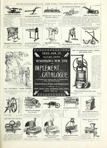 | Keywords: Autumn bulbs catalogue (16425992346).jpg PETER HENDERSON CO NEW YORK ” IMPLEMENTS AND TOOLS <br> '/5 <br> The Hendersao Chilkd Plow <br> Ah hanl asKteoI; all iinprovL - <br> nK- iU4; the iH;»l plow <br> Ughl 1 linrsc gi riO <br> Mt-'diufii 1 lionfe 6 CU <br> Full 1 buisc' g riU <br> J i lit 2 lionie 7 50 <br> lc' lium 2hoine – – 8 00 <br> Full 2 horse 8 50 <br> Whwl fxlia 1 00 <br> J«iinter fxira 2 U0 <br> Gold Medal Subsoil Plow <br> For foMou Irit a coininuii <br> w l nakli t op tin- – iilh to <br> liiKplh if IJillchi-i ilh 1 hono <br> plow aDd20irH'h 'Uwitli2- ioi-su <br> without tlirowing subsoil on <br> l p <br> 1 liorst 85 00 with wheel J« 00 <br> 2 lior-k- t; 0O wlch whtfl 18 U <br> Henderson Lever Set <br> All Steel Harrow <br> All sticl n spiki-toolh bur- <br> row u Hiuoothiiii; luirrow ull <br> ill one <br> 1 Hettloil 4 ft 25 tifth fe 75 <br> a ¢ ¢ 8 ¢ ¢ 50 ¢ ¢ 1 ; o« <br> a 12 75 ¢ ¢ 18 U <br> The eofliesfe workincr most <br> durablf Hrifntirtc antriK-st on <br> the inarki't All mctJil finest <br> quality knives the automatic <br> puunls ab ' olutely proteet from <br> dani er will cut one or two <br> rows nt once Can be ojKTatwl <br> by I ither one or two men <br> I rice <br> Planet Jr Celery Hllkr <br> Has It-'vtT wheel for r»» rula- <br> tlnjf depth; lever expander to <br> rr-K ilato quantity of earth <br> thrown Tno ¢ – Sinple Hiller <br> thrtnvH higlier and works In <br> imrrower rows but only does <br> one side of a row <br> Double row hiller U 00 <br> 16 00 Single row liiller <br> 11 00 <br> Champion Root Cutter <br> Thi- best ebe iii root cutter <br> for turnips carrots be -ts <br> etc 7 00 <br> L«ver Feed Cutter <br> Furnished witbtrauKc i late <br> c S3 50 <br> 'Hide Roller Feed Cutter <br> No OO i; ;5 Burrel Improved Cora Shelter <br> Ym j thcMs both inrk'c and sritill <br> No O <br> Other size u <br> and scjiarates cob «f j <br> Steel Wing Shovel Plow <br> and Potato Digger <br> Price gd iW; or with jiotato- <br> di rjrintr attachment y tf»j <br> THE <br> PLUjrLET <br> FRUIT PICKER <br> THE PLUMLEY FRUIT PICKER <br> Tlie fruit rollii down a cloth ttibe conse- <br> quently the picker floes n- tt have to be lowered <br> Price without jmlc 1 00 <br> with pole 1 25 <br> ' v ' vy vy v 'iv 'iv 'iv 'iv ' v7 v iv ' v 'ivy v <br> SEND FOR IT <br> MAILED JFREfi <br> HENDERSON'S NEW TOOL <br> IMPdMEtfT <br> olfFflLGGUE <br> It Describes And Shovvs Large liLusTRArioNS'OP <br> – These and Many Other – ' – – <br> Implements -Tools and Requisites <br> ' ¢ FdrThc -y- <br> FARM GARDEN LAWN GREENHOUSE; DAIfW STABLE <br> j ' POULTRY YARD ETC A <br> THE HtTCHINSON FAMILY CIDER <br> AND WINE niLL <br> It will grind <br> from e/j /'t to <br> tt-n dushirh o/ <br> apples and <br> /rom Un io <br> tivtl-'C bushels <br> o/grapt-s i ur <br> rents t'tc per <br> tiour Thecurb <br> or pic s will <br> coniaia I he po- <br> mace of one <br> bushcif r more <br> of apples One <br> maa can make <br> with it from <br> tluo to three <br> bnrrels o/ ci <br> der or from <br> one hundred <br> to one hund- <br> red and /t/ty <br> ga 1 1 o n s oj <br> wine pi- r day <br> Weight about <br> jco pounds <br> Prices Hutchinson Cider Mill <br> With ll xU inch curl 10 00 <br> ¢ 12-\1'- – – 11 00 <br> Regulation <br> Garden Wheelbarrow <br> Cahoon's Broadcast <br> Seed Sower <br> Broadcasts 16 to 10 feet wheat <br> rye oais barley tlinothv clo- <br> ver millet etc Price 3 75 <br> A superior Barrow hand- <br> somely iiainted and stri ed ; <br> iron leg oiaces liolted on <br> Number Size Price <br> No 2 Toy's 2 7 - <br> No \ MeOiuin 3 ' 0 <br> No 5 Large 1 00 <br> Plneland Incubators <br> 30-egKsizc <br> 60 ' <br> 100 <br> £00 <br> 300 <br> 3t» <br> 100 <br> 9 50 <br> 16 00 <br> 20 1 0 <br> 3- ' llO <br> 10 110 <br> 15 00 <br> 60 00 <br> Horse Radish Qrater <br> Box patt Tli cnpjicit v 15 lbs <br> all hour I'ei'i'onited tin cylin- <br> der 6 50 Wooden cylinder <br> studded sti-el pins 7 50 <br> Apple Parer Corer and SHcer <br> The porinprs and Juice fall <br> clear of the workinpf parts; <br> sirnnK durable and i;o »s gooii <br> work It can be used to pare <br> only without coriiiif and sllc- <br> ingr if desired Price 3 <br> Vegetable Grater <br> Orates apples corn horso <br> radish cheese etc i3 00 <br> Family Slaw Cut'tr and <br> Vegetable Sl cer <br> Slices thick or thin potatocfi <br> cucumbers onion etc 3 00 <br> Fruit Wine and Jelly <br> Press <br> Grape and RaUio Seeder <br> Family siie 1 00 <br> Will 8ce l 1 lb in 6 minutes <br> Hotel alzv SJO <br> Will secKl 1 lb In 1 minute <br> Ejctmcta Juice <br> and cjei'Ls s -c Is <br> and skins in one <br> operation Fiun- <br> lly Bixe capacity 1 quart 3 00 43899787 149965 78524 Page 75 Text http //www biodiversitylibrary org/page/43899787 1900 10 5962/bhl title 78524 Henry G Gilbert Nursery and Seed Trade Catalog Collection ; Peter Henderson Co Biodiversity Heritage Library Autumn bulbs catalogue 1900 Garden Stories Bulbs Plants Catalogs Equipment and supplies Flowers Gardening Seeds Trade catalogues U S Department of Agriculture National Agricultural Library bhl page 43899787 dc identifier http //biodiversitylibrary org/page/43899787 Peter Henderson Co bhlGardenStories BHLinbloom bulbs plants u s department of agriculture national agricultural library peter henderson co bhlgardenstories bhlinbloom Information field Flickr posted date ISOdate 2015-02-05 Check categories 2015 August 24 CC-BY-2 0 BioDivLibrary https //flickr com/photos/61021753 N02/16425992346 2015-08-24 23 59 25 cc-by-2 0 PD-old-70-1923 Autumn bulbs catalogue Photos uploaded from Flickr by Fæ using a script |
