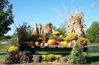 Keywords: autumn fall pond scarecrows pumpkins cornstalks flowers wheelbarrow tree stumps halloween