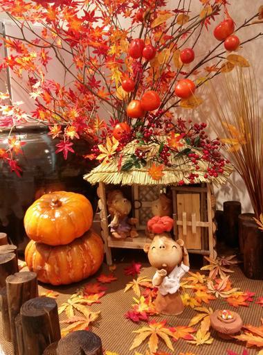 Keywords: autumn leaves pumpkin miniatures thatch roofed hose persimmon autumn