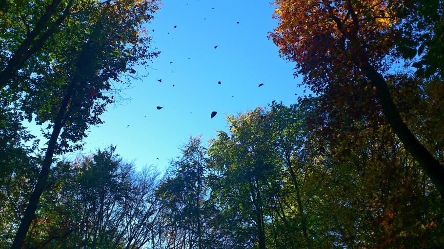 Keywords: autumn leaves wind colorful forest trees canopy nature treetop sky view perspective sky