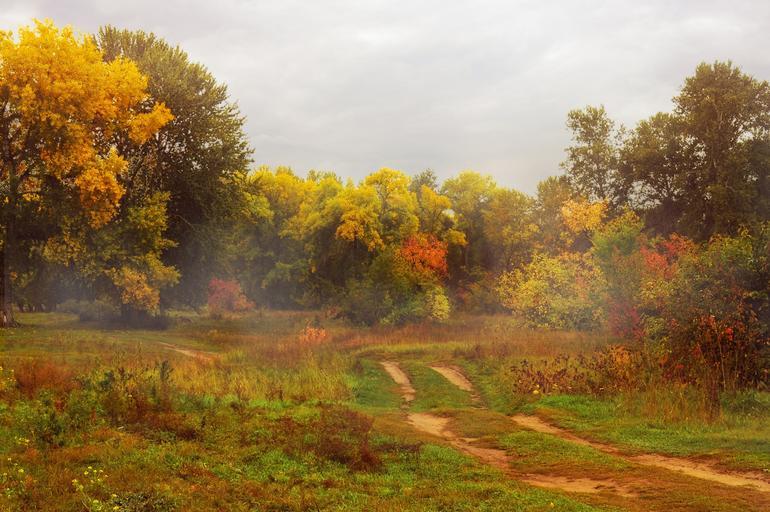 Keywords: autumn trees gold leaves fog forest nature landscape colorful lonely