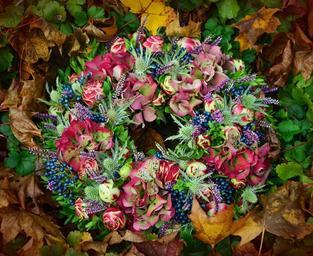 Keywords: autumn wreath arrangement decoration floral wreath autumn decoration pink floristisch flowers floral decorations grabschmuck