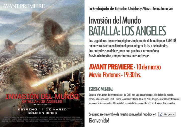 | Keywords: movie cine uruguay flick película avant premiere avantpremiere usembassymvd world invasion battle la worldinvasionbattlela pre-estreno preestreno text La embajada de EEUU y Movie te invitan a ver la Avant Premiere Exclusiva de la película "Invasión del Mundo: Batalla Los Ángeles", que será estrenada la semana próxima en Uruguay y en todo el mundo. Es una película de acción y ciencia ficción de invasión alienígena que está dirigida por Jonathan Liebesman y protagonizada por Aaron Eckhart, Michelle Rodriguez, Ramon Rodriguez, Bridget Moynahan, Ne-Yo y Michael Peña, entre otros. Para formar parte de nuestra lista de invitados, lo único que debes hacer es cliquear "ASISTIRE" en la invitación ( www.facebook.com/event.php?eid=186612894707538 ) y recibirás una entrada DOBLE para que puedas ir acompañado. LOS PRIMEROS 100 en cliquear "ASISTIRE" recibirán una entrada DOBLE. Recuerda que la película es el próximo Jueves 10 de marzo en el cine MOVIE de Portones Shopping. Previo al inicio del filme compartiremos unos refrescos. Nos vemos ahí! Te esperamos! DEBES SER FAN DE NUESTRA PÁGINA PARA PARTICIPAR. Hazte fan cliqueando ME GUSTA en nuestra página (ingresa a www.facebook.com/US.Embassy.Montevideo) El evento tendrá lugar en el CIne Movie Portones, en Montevideo, Uruguay La embajada de EEUU y Movie te invitan a ver la Avant Premiere Exclusiva de la película "Invasión del Mundo: Batalla Los Ángeles", que será estrenada la semana próxima en Uruguay y en todo el mundo. Es una película de acción y ciencia ficción de invasión alienígena que está dirigida por Jonathan Liebesman y protagonizada por Aaron Eckhart, Michelle Rodriguez, Ramon Rodriguez, Bridget Moynahan, Ne-Yo y Michael Peña, entre otros. Para formar parte de nuestra lista de invitados, lo único que debes hacer es cliquear "ASISTIRE" en la invitación ( www.facebook.com/event.php?eid=186612894707538 ) y recibirás una entrada DOBLE para que puedas ir acompañado. LOS PRIMEROS 100 en cliquear "ASISTIRE" recibirán una entrada DOBLE. Recuerda que la película es el próximo Jueves 10 de marzo en el cine MOVIE de Portones Shopping. Previo al inicio del filme compartiremos unos refrescos. Nos vemos ahí! Te esperamos! DEBES SER FAN DE NUESTRA PÁGINA PARA PARTICIPAR. Hazte fan cliqueando ME GUSTA en nuestra página (ingresa a www.facebook.com/US.Embassy.Montevideo) El evento tendrá lugar en el CIne Movie Portones, en Montevideo, Uruguay |