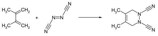 Keywords: Azodicarbonitrile reaction01.svg en Reaction of azodicarbonitrile with 2 3-dimethylbutadiene de Reaktion of Azodicarbonitril mit 2 3-Dimethylbutadien own Steffen 962 2015-02-03 PD-chem Azodicarbonitrile Cc-zero