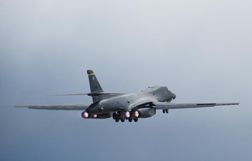 Keywords: B-1B Lancer takes off Air Force Base aircraft