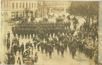 | Keywords: outdoor monochrome Description: Black and white photo postcard featuring a large group of men in World War I uniforms standing in the Square in Goderich, Ontario. The Model Theatre is in the background. The photograph is of B (Goderich) Company. Date: 1916 Object ID : 2007.0062.129 Order a higher-quality version of this item by contacting the Huron County Museum (fee applies). Description: Black and white photo postcard featuring a large group of men in World War I uniforms standing in the Square in Goderich, Ontario. The Model Theatre is in the background. The photograph is of B (Goderich) Company. Date: 1916 Object ID : 2007.0062.129 Order a higher-quality version of this item by contacting the Huron County Museum (fee applies). |