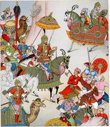 Keywords: Babur setting out with his army.jpg en Racinet's view of Babur setting out with his army 1876 ; a larger scan Source ebay Jan 2002 Color Lithograph from 1876 Military Costumes of India - 16th Century Legend 'These fragments are taken from a 16th C painting representing Djahir - El-din Mohammed Bâber nicknamed the Tiger the king and emperor of India leaving at the head of his army to invade the province of Mazindera in Persia He was the Indian emperor 1526-30 and founder of the Mughal dynasty of India a descendant of the Mongol conqueror Genghis Khan and also of Timur Tamerlane He was a military adventurer and soldier of distinction and a poet and diarist of genius as well as a statesman Babur is rightly considered the founder of the Indian Mughal Empire even though the work of consolidating the empire was performed by his grandson Akbar Babur moreover provided the glamour of magnetic leadership that inspired the next two generations Babur was a military adventurer of genius an empire builder of good fortune and an engaging personality He was also a Turkey poet of considerable gifts that would have won him distinction apart from his political career He was a lover of nature who constructed gardens wherever he went and complemented beautiful spots by holding convivial parties Finally his prose memoirs the Babur-nameh have become a world classic of autobiography They were translated from Turki into Persian in Akbar's reign 1589 and were translated into English in two volumes in 1921-22 with the title Memoirs of Babur They portray a ruler unusually magnanimous for his age cultured witty convivial and full of good fellowship and adventurous spirit with a sensitive eye for natural beauty In this print the Mogul is represented with all the attributes of the ruler especially the parasol carried over him He is wearing a silk jacket short sleeved and a round shaped skirt with ornamental design and large metal button-plate on his chest The jacked is padded to protect against the arrows and his knees are also protected by metal plates In his right hand he is holding one of the offensive weapons of the time a spear with ends being finished with decorated metal on the left side he wears a saber and on his belt a quiver with feather arrows is attached The soldier behind him carries a hammer like weapon which could also be a heavy wood club he is holding it with both his hands indicating the heaviness of the weapon The mogul's horse is entirely protected with armor of overlapped blades An interesting feature is that he does not were the rider's boots but his personal slippers Another interesting feature of this painting is the lack of elephants in his army Before the ruler we see a number of infantrymen who proceed him and by shouting create a necessary room for him to pass 1876 http //www columbia edu/itc/mealac/pritchett/00routesdata/1600_1699/french/racinet/racinet html Racinet other versions Custom license marker 2015 11 09 PD-Old Mughal Empire Uploaded with UploadWizard |