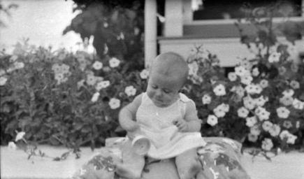 | Keywords: Baby on Pillow.jpg  en A baby sitting on a pillow in front of flowers and holding an item in her right hand century 20 http //digital lib uh edu/cdm4/item_viewer php CISOROOT /p15195coll17 CISOPTR 388 CISOBOX 1 REC 15 Walker Harry photographer cc-zero Black and white photographs of babies Photographs in the University of Houston Libraries |