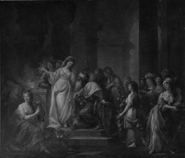 | Keywords: Bacciarelli Dedication of the Temple.jpg Dedication of the Temple Poświęcenie świątyni Creator Marcello Bacciarelli 1788-1791 oil canvas Marek Kwiatkowski 1973 Łazienki Państwowe Wydawnictwo Naukowe The painting was one of a series History of Solomon painted to embellish the so-called Solomon Room in the Palace on the Water in Warsaw All the paintings were deliberately and completely destroyed by the Germans in 1944 burned in a campfire during the preparations to blow up the palace<ref name lazienki > cite web http //www lazienki-krolewskie pl/content/view/147/210/lang pl/ Sala Salomona - Palac na Wyspie Muzeum Łazienki Królewskie Royal Baths Museum 2010-02-19 </ref> see Planned destruction of Warsaw Object history PD-Art PD-old-100 References Reflist Paintings by Marcello Bacciarelli Paintings destroyed in Poland during World War II Temple of Solomon Solomon Room in the Palace on the Water |