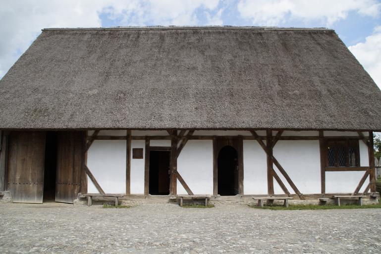 Keywords: bach ritterburg knight's castle castle lower needle middle ages wooden castle tower kanzach southern germany medieval woods building architecture reconstruction reconstructed baden württemberg germany stall stables barn building truss animal husbandry thatched roof reed thatched fachwerkhaus facade country idyll ancient