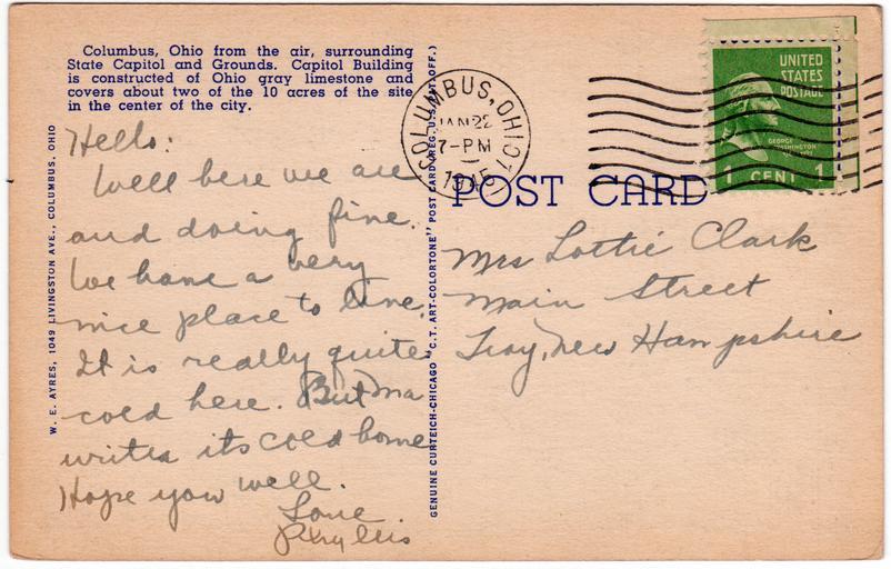 Keywords: postcard postcards white border whiteborder white border era whiteborderera used postmarked stamp handwriting columbus columbus, ohio columbusohio ohio divided back dividedback 1945 1940s wwii-era wwiiera w.e. ayres weayres w.e. ayers weayers curt teich co. curtteichco curteich curteich-chicago curteichchicago c.t. art colortone ctartcolortone state house statehouse ohio state house ohiostatehouse ohio state capitol ohiostatecapitol document text writing sketch drawing whiteboard Description on front of card: Capitol Square, in the Heart of Columbus, Ohio No. in Series: A-34 Description on back of card: Columbus, Ohio from the air, surrounding State Capitol and Grounds. Capitol Building is constructed of Ohio gray limestone and covers about two of the 10 acres of the site in the center of the city. Published by: W.E. Ayres, Columbus, Ohio | Genuine Curteich-Chicago "C.T. Art-Colortone" post card, a tradename under Curt Teich Co., Chicago, Illinois Used. Publisher Note: Curt Teich emigrated to Chicago in 1895. He had worked as a lithographer in Lobenstein, Germany. He founded the Curt Teich Company in 1898, concentrating on newspaper and magazine printing. He was an early publisher of postcards, but he didn't begin printing them himself until 1908. According to MetroPostcard.com, "As his competition dwindled, his sales expanded and his American factories would eventually turn out more postcards than any other in the United States. " The company was best known for their wide range of advertising and postcards of North America. By the 1920s, it was producing so many postcards with borders that they became recognized as a type dubbed "White Border Cards," creating an "era." Curt Teich started using offset presses in 1907, but it took a number of years before he had offset presses made to his satisfaction, and many more years for him to perfect the method. His innovations in this printing technique directly led to the production of what we now call "linens" by the early 1930s. The company aided the war effort during the second world war by also printing many military maps. Curt Teich eventually turned management of the company over to his son, but he remained active in company operations throughout its history. Curt Teich died in 1974 and the family business was sold to Regensteiner Publishers who continued to print postcards at the Chicago plant until 1978 when the rights to the company name and processes were sold to the Irish company, John Hinde Ltd. Their California subsidiary now prints postcards under the name John Hinde Curteich, Inc. Source: www.metropostcard.com/publisherst.html Description on front of card: Capitol Square, in the Heart of Columbus, Ohio No. in Series: A-34 Description on back of card: Columbus, Ohio from the air, surrounding State Capitol and Grounds. Capitol Building is constructed of Ohio gray limestone and covers about two of the 10 acres of the site in the center of the city. Published by: W.E. Ayres, Columbus, Ohio | Genuine Curteich-Chicago "C.T. Art-Colortone" post card, a tradename under Curt Teich Co., Chicago, Illinois Used. Publisher Note: Curt Teich emigrated to Chicago in 1895. He had worked as a lithographer in Lobenstein, Germany. He founded the Curt Teich Company in 1898, concentrating on newspaper and magazine printing. He was an early publisher of postcards, but he didn't begin printing them himself until 1908. According to MetroPostcard.com, "As his competition dwindled, his sales expanded and his American factories would eventually turn out more postcards than any other in the United States. " The company was best known for their wide range of advertising and postcards of North America. By the 1920s, it was producing so many postcards with borders that they became recognized as a type dubbed "White Border Cards," creating an "era." Curt Teich started using offset presses in 1907, but it took a number of years before he had offset presses made to his satisfaction, and many more years for him to perfect the method. His innovations in this printing technique directly led to the production of what we now call "linens" by the early 1930s. The company aided the war effort during the second world war by also printing many military maps. Curt Teich eventually turned management of the company over to his son, but he remained active in company operations throughout its history. Curt Teich died in 1974 and the family business was sold to Regensteiner Publishers who continued to print postcards at the Chicago plant until 1978 when the rights to the company name and processes were sold to the Irish company, John Hinde Ltd. Their California subsidiary now prints postcards under the name John Hinde Curteich, Inc. Source: www.metropostcard.com/publisherst.html |