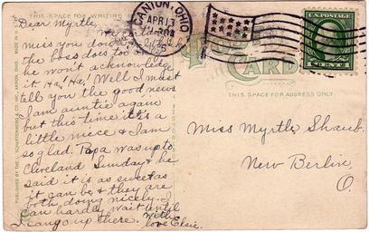 Keywords: postcard ohio canton, ohio cantonohio stamp postmarked used dueber-hampden watch works dueberhampdenwatchworks l. schartenberg & co., inc. lschartenbergcoinc curt teich co. curtteichco divided back era dividedbackera 1915 divided back dividedback shaub myrtle shaub myrtleshaub 1910s flag cancel flagcancel canton cancel text writing document Description on card: Dueber-Hampden Watch Works, Canton, Ohio. Publisher: L. Shartenberg & Co., Inc., Akron, Ohio | C.T. Photochrome by Curt Teich Co., Chicago, Illinois Postmark on back of card: Apr 13, 1915(?) 11:30 a.m. Message: Dear Myrtle, We certainly miss you down here. I think the boss does too only he won't acknowledge it. Ha! Ha! Well I must tell you the good news. I am auntie again but this time it'a a little niece & I am so glad. Papa was up to Cleveland Sunday & he said it was as sweet as it can be & they are both doing nicely. I can hardly wait until I can go up there. With love, Elsie Addressed to: Miss Myrtle Shaub New Berlin, O. Used. Publisher Note: Curt Teich emigrated to Chicago in 1895. He had worked as a lithographer in Lobenstein, Germany. He founded the Curt Teich Company in 1898, concentrating on newspaper and magazine printing. He was an early publisher of postcards, but he didn't begin printing them himself until 1908. According to MetroPostcard.com, "As his competition dwindled, his sales expanded and his American factories would eventually turn out more postcards than any other in the United States. " The company was best known for their wide range of advertising and postcards of North America. By the 1920s, it was producing so many postcards with borders that they became recognized as a type dubbed "White Border Cards," creating an "era." Curt Teich started using offset presses in 1907, but it took a number of years before he had offset presses made to his satisfaction, and many more years for him to perfect the method. His innovations in this printing technique directly led to the production of what we now call "linens" by the early 1930s. The company aided the war effort during the second world war by also printing many military maps. Curt Teich eventually turned management of the company over to his son, but he remained active in company operations throughout its history. Curt Teich died in 1974 and the family business was sold to Regensteiner Publishers who continued to print postcards at the Chicago plant until 1978 when the rights to the company name and processes were sold to the Irish company, John Hinde Ltd. Their California subsidiary now prints postcards under the name John Hinde Curteich, Inc. Source: www.metropostcard.com/publisherst.html Description on card: Dueber-Hampden Watch Works, Canton, Ohio. Publisher: L. Shartenberg & Co., Inc., Akron, Ohio | C.T. Photochrome by Curt Teich Co., Chicago, Illinois Postmark on back of card: Apr 13, 1915(?) 11:30 a.m. Message: Dear Myrtle, We certainly miss you down here. I think the boss does too only he won't acknowledge it. Ha! Ha! Well I must tell you the good news. I am auntie again but this time it'a a little niece & I am so glad. Papa was up to Cleveland Sunday & he said it was as sweet as it can be & they are both doing nicely. I can hardly wait until I can go up there. With love, Elsie Addressed to: Miss Myrtle Shaub New Berlin, O. Used. Publisher Note: Curt Teich emigrated to Chicago in 1895. He had worked as a lithographer in Lobenstein, Germany. He founded the Curt Teich Company in 1898, concentrating on newspaper and magazine printing. He was an early publisher of postcards, but he didn't begin printing them himself until 1908. According to MetroPostcard.com, "As his competition dwindled, his sales expanded and his American factories would eventually turn out more postcards than any other in the United States. " The company was best known for their wide range of advertising and postcards of North America. By the 1920s, it was producing so many postcards with borders that they became recognized as a type dubbed "White Border Cards," creating an "era." Curt Teich started using offset presses in 1907, but it took a number of years before he had offset presses made to his satisfaction, and many more years for him to perfect the method. His innovations in this printing technique directly led to the production of what we now call "linens" by the early 1930s. The company aided the war effort during the second world war by also printing many military maps. Curt Teich eventually turned management of the company over to his son, but he remained active in company operations throughout its history. Curt Teich died in 1974 and the family business was sold to Regensteiner Publishers who continued to print postcards at the Chicago plant until 1978 when the rights to the company name and processes were sold to the Irish company, John Hinde Ltd. Their California subsidiary now prints postcards under the name John Hinde Curteich, Inc. Source: www.metropostcard.com/publisherst.html |