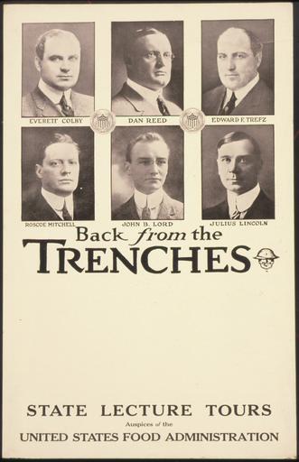 Keywords: Back from the Trenches. Everett Colby, Dan Reed, Edward F. Trefz, Roscoe Mitchell, John B. Lord, Julius Lincoln. State L - NARA - 512524.jpg Scope and content General notes 512524 Local identifier 4-P-85 U S Food Administration Educational Division Advertising Section 01/15/1918 - 01/1919 Still Picture Records Section Special Media Archives Services Division NWCS-S National Archives at College Park 8601 Adelphi Road College Park MD 20740-6001 other date circa 1917 1919 Record group Record Group 4 Records of the U S Food Administration 1917 - 1920 Record group ARC 333 World War I Posters compiled 1917 - 1919 Series ARC 512439 File unit File unit ARC Variant control numbers NAIL Control Number NWDNS-4-P-85 Other versions <gallery> File Back_from_the_Trenches _Everett_Colby _Dan_Reed _Edward_F _Trefz _Roscoe_Mitchell _John_B _Lord _Julius_Lincoln _State_L_-_NARA_-_512524 tif tif File Back_from_the_Trenches _Everett_Colby _Dan_Reed _Edward_F _Trefz _Roscoe_Mitchell _John_B _Lord _Julius_Lincoln _State_L_-_NARA_-_512524 jpg jpg </gallery> NARA-cooperation PD-USGov World War I posters of the United States United States Food Administration |
