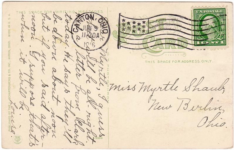 Keywords: postcard ohio canton, ohio cantonohio stamp postmarked used 1916 co. co c.t. american art ctamericanart curt teich co. curtteichco during wwi duringwwi divided back dividedback pictorial cancellation pictorialcancellation shaub myrtle shaub myrtleshaub 1910s flag cancel flagcancel cancel wwi-era wwiera canton text writing document Description on front of card: Stone Bridge in West Lawn Cemetery, Canton, Ohio Publisher: L.Schartenberg & Co., Inc., Akron, Ohio | C.T. Photochrome by Curt Teich Co., Chicago, Illinois Postmark on card: Jun 9, 1916 11:30 a.m. Message: Dear Myrtle, I guess that will be al -right have a letter from Clark today. He says they'll be down about noon but if you said afternoon. I suppose that's when it will be. Lorrie Addressed to: Miss Myrtle Shaub New Berlin, O. Used. Buy this card Publisher Note: Curt Teich emigrated to Chicago in 1895. He had worked as a lithographer in Lobenstein, Germany. He founded the Curt Teich Company in 1898, concentrating on newspaper and magazine printing. He was an early publisher of postcards, but he didn't begin printing them himself until 1908. According to MetroPostcard.com, "As his competition dwindled, his sales expanded and his American factories would eventually turn out more postcards than any other in the United States. " The company was best known for their wide range of advertising and postcards of North America. By the 1920s, it was producing so many postcards with borders that they became recognized as a type dubbed "White Border Cards," creating an "era." Curt Teich started using offset presses in 1907, but it took a number of years before he had offset presses made to his satisfaction, and many more years for him to perfect the method. His innovations in this printing technique directly led to the production of what we now call "linens" by the early 1930s. The company aided the war effort during the second world war by also printing many military maps. Curt Teich eventually turned management of the company over to his son, but he remained active in company operations throughout its history. Curt Teich died in 1974 and the family business was sold to Regensteiner Publishers who continued to print postcards at the Chicago plant until 1978 when the rights to the company name and processes were sold to the Irish company, John Hinde Ltd. Their California subsidiary now prints postcards under the name John Hinde Curteich, Inc. Source: www.metropostcard.com/publisherst.html Description on front of card: Stone Bridge in West Lawn Cemetery, Canton, Ohio Publisher: L.Schartenberg & Co., Inc., Akron, Ohio | C.T. Photochrome by Curt Teich Co., Chicago, Illinois Postmark on card: Jun 9, 1916 11:30 a.m. Message: Dear Myrtle, I guess that will be al -right have a letter from Clark today. He says they'll be down about noon but if you said afternoon. I suppose that's when it will be. Lorrie Addressed to: Miss Myrtle Shaub New Berlin, O. Used. Buy this card Publisher Note: Curt Teich emigrated to Chicago in 1895. He had worked as a lithographer in Lobenstein, Germany. He founded the Curt Teich Company in 1898, concentrating on newspaper and magazine printing. He was an early publisher of postcards, but he didn't begin printing them himself until 1908. According to MetroPostcard.com, "As his competition dwindled, his sales expanded and his American factories would eventually turn out more postcards than any other in the United States. " The company was best known for their wide range of advertising and postcards of North America. By the 1920s, it was producing so many postcards with borders that they became recognized as a type dubbed "White Border Cards," creating an "era." Curt Teich started using offset presses in 1907, but it took a number of years before he had offset presses made to his satisfaction, and many more years for him to perfect the method. His innovations in this printing technique directly led to the production of what we now call "linens" by the early 1930s. The company aided the war effort during the second world war by also printing many military maps. Curt Teich eventually turned management of the company over to his son, but he remained active in company operations throughout its history. Curt Teich died in 1974 and the family business was sold to Regensteiner Publishers who continued to print postcards at the Chicago plant until 1978 when the rights to the company name and processes were sold to the Irish company, John Hinde Ltd. Their California subsidiary now prints postcards under the name John Hinde Curteich, Inc. Source: www.metropostcard.com/publisherst.html |