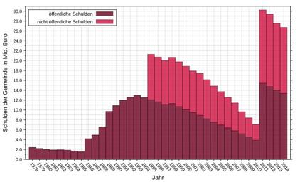 | Keywords: Bad Wiessee Schuldenentwicklung 1.svg en Bad Wiessee debt developments 1978-2014 de Bad Wiessee Schuldenentwicklung von 1978-2014 ValidSVG own ; Datenquelle Bayerisches Landesamt für Statistik “ Tabelle 71327-001z - Code 09182111 Stefan Meister 2016-03-14 Cc-zero Gnuplot script to generate this plot gnuplot <source lang gnuplot > Bad Wiessee Schuldenentwicklung 1978-2014 Pay attention to handle source as UTF-8 for german Umlaute reset set datafile separator ; unset key set key top left box 1 noreverse Right spacing 1 25 width -9 0 font Arial 22 set bars fullwidth set style data histograms set style histogram rowstacked set style fill transparent solid 0 8 border lc rgbcolor 0x80000000 set linetype 1 lw 1 lc rgbcolor 0x700020 set linetype 2 lw 1 lc rgbcolor 0xd01040 set grid xtics ytics mytics lc rgbcolor 0x200080 set xlabel Jahr offset 0 1 font Arial 28 set xtics nomirror out scale 0 5 0 25 rotate by 310 offset -1 2 0 1 font Arial 22 set ylabel Schulden der Gemeinde in Mio Euro offset 1 9 0 font Arial 28 set yrange 0 31000 set ytics out scale 0 5 0 25 offset 0 4 0 format 1s autofreq 2000 font Arial 22 set mytics 2 set term svg size 1400 850 dynamic enhanced font Arial 26 set output Bad Wiessee Schuldenentwicklung 1 svg plot '-' using 2 xtic 1 lt 1 title öffentliche Schulden \ '-' using 3 lt 2 title nicht öffentliche Schulden 1978;2410;0 1979;2202;0 1980;1995;0 1981;1903;0 1982;1937;0 1983;1859;0 1984;1700;0 1985;1545;0 1986;4175;0 1987;4922;0 1988;6583;0 1989;9716;0 1990;10894;0 1991;11950;0 1992;12596;0 1993;12946;0 1994;12509;0 1995;12064;9196 1996;11635;9085 1997;11124;8892 1998;11289;9377 1999;10677;9082 2000;10082;8781 2001;9462;8454 2002;8910;8543 2003;8187;7957 2004;7535;7317 2005;6967;6762 2006;6388;6198 2007;5796;5621 2008;5178;4478 2009;4538;3879 2010;3857;3241 2011;15420;14838 2012;14718;14718 2013;14019;13527 2014;13362;13362 e 1978;2410;0 1979;2202;0 1980;1995;0 1981;1903;0 1982;1937;0 1983;1859;0 1984;1700;0 1985;1545;0 1986;4175;0 1987;4922;0 1988;6583;0 1989;9716;0 1990;10894;0 1991;11950;0 1992;12596;0 1993;12946;0 1994;12509;0 1995;12064;9196 1996;11635;9085 1997;11124;8892 1998;11289;9377 1999;10677;9082 2000;10082;8781 2001;9462;8454 2002;8910;8543 2003;8187;7957 2004;7535;7317 2005;6967;6762 2006;6388;6198 2007;5796;5621 2008;5178;4478 2009;4538;3879 2010;3857;3241 2011;15420;14838 2012;14718;14718 2013;14019;13527 2014;13362;13362 e </source> Cc-zero Bad Wiessee Images with Gnuplot source code |