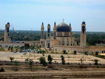 | Keywords: Baghdad Mosque Umm al-Qura, as seen from the freeway in April 2004.jpg  Uploaded with en wp UW marker 2016 10 10 مشهد لجامع أم القرى كما يشاهد من على طريق الخط السريع Umm al-Qura mosque in April 2004 showing three of the four perimeter minarets each resembling a Kalashnikov rifle and three of the four minarets around the dome each in the shape of a Scud missile on its Launchpad Umm_al-Qura_Mosque Source I was part of 1/227 AVN BN 1 CD in OIF 1 2 and 3 I took this photo as our convoy drove through Baghdad on our way to Camp Taji I rode in one of the larger trucks standing up through a hole in the roof to be able to fire my weapon but I had such a great unobstructed view I was more interested in getting pictures of Baghdad with my disposable Kodak camera I was lucky I had my camera in hand or else I would've missed it <br/> Previously published Never published own 2004-04-18 SPC Jeffrey Allan Backowski II ;Other information I scanned this picture over a decade ago and I still have the original if I were to scan it on a new scanner it would look way better Mosques in Baghdad Mosques in Iraq Arabic architecture  |