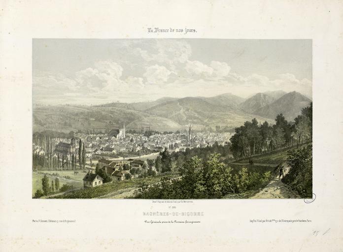 | Keywords: Bagnères-de-Bigorre - Vue Générale prise de la Fontaine ferrugineuse - Fonds Ancely - B315556101 A MERCEREAU 7 017.jpg Impression en 3 coul par Frick frères à Paris Fait partie d'un ensemble de recueils de lithographies de Mercereau composés de lithographies provenant de La France de nos jours vaste suite publiée par livraisons de 1853 à 1876 et comprenant 475 planches en deux tirages l'un à deux teintes noir et bistre l'autre en couleurs Les libraires ont réuni ces planches en albums de composition variable quant au nombre de planches et aux dessinateurs Asselineau Mercereau Maurice Deroy etc Un titre Les Pyrénées par Ch Mercereau; Bagnères-de-Luchon par Ch Mercereau était frappé sur le plat supérieur de la reliure de l'album ainsi que le nom du Libraire pour lequel il était réalisé La plupart des recueils de ces planches pyrénéennes portent le nom de Sajous libraire à Bagnères-de-Luchon Pl 1 à 18 numérotées de 370 à 386 Pl 374 pl 5 et 6 en double -- Pl 19 20 et 21 numérotées respectivement 407 415 et 418 Ces trois pl ont été dessinées et lithographiées par Asselineau -- Pl 22 23 et 24 numérotées 438 439 et 440 -- Pl 22 lith par Aubrun -- Pl 25 numérotée 441 -- Pl 26 à 40 numérotées de 327 à 341 -- Pl 41 à 46 numérotées de 363 à 368 -- Pl 47 numérotée 369 -- Pl 48 num 292 -- Pl 49 et 50 num 264 et 265 -- Pl 51 et 52 num 268 et 269 -- Pl 53 à 55 num de 293 à 295 -- Pl 56 num 300 -- Pl 57 à 59 num de 307 à 309 -- Pl 60 à 70 num de 316 à 326 -- Pl 71 num 63 dessin et lith d'Asselineau imprimerie Destouches -- Pl 72 et 73 num 87 et 88 dessin et lith d'Asselineau imprimerie Destouches -- Pl 74 num 124 signée Lebreton éditée chez Lalonde à Paris et imprimée chez Becquet frères à Paris -- Pl 75 num 161 dessin et litho d'Asselineau imprimerie Destouches --Pl 76 à 78 num de 207 à 209 -- Pl 79 à 81 num de 211 à 213 -- Pl 82 num 220 dessin et lith de Maurice imprimerie Destouches -- Pl 83 à 86 num de 226 à 229 -- Pl 87 et 88 num 234 et 235 -- Pl 89 à 91 num de 273 à 275 -- Pl 92 et 93 num 290 et 291 Pièces jointes 6 pl sépia dont certaines sont des doubles du recueil de Mercereau Les cinq premières planches sont numérotées respectivement 318 321 324 331 386 La dernière planche n'est pas extraite de La France de nos jours mais de L'Espagne pittoresque et monumentale Ces six planches sont signées Mercereau éditées chez Sinnet et imprimées chez Frick frères Ancely René 1876 - 1966 Possesseur fre public domain domaine public B315556101_A_MERCEREAU_7_017 jpg image/jpeg 1 f de pl lithogr ; 31 cm oblong Frick frères Imprimeur Sinnet F Éditeur http //numerique bibliotheque toulouse fr/collect/general/index/assoc//ark /74899/B315556101_A_MERCEREAU_7_017 dir/B315556101_A_MERCEREAU_7_017 jpg Bibliothèque municipale de Toulouse A-MERCEREAU 7-17 Creator Charles Mercereau http //catalogues toulouse fr/web2/tramp2 exe/do_keyword_search/log_in setting_key BMT1 servers 1home query p001641 vignette http //numerique bibliotheque toulouse fr/collect/general/index/assoc//ark /74899/B315556101_A_MERCEREAU_7_017 dir/B315556101_A_MERCEREAU_7_017_thumb jpeg between 1853 1876 Bagnères-de-Bigorre - Vue Générale prise de la Fontaine ferrugineuse B315556101_A_MERCEREAU_7_017 lithography - engraving - color lithograph - woodblock print Lithographs of France Hautes-Pyrénées Charles Mercereau Bagnères-de-Bigorre Towns in art Bagnères-de-Bigorre Valleys in art Hautes-Pyrénées Valleys of Hautes-Pyrénées Mountains of France in art Pyrénées Mountains of Hautes-Pyrénées ¢ Geography of Bagnères-de-Bigorre Trails in France Pyrénées Trails in art Pyrénées 1860s lithographs Hautes-Pyrénées |