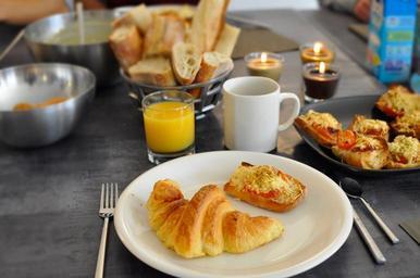 Keywords: bakery coffee plate food breakfast bread cup juice glass of juice pastry alarm clock morning