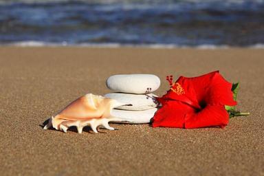 Keywords: balance beach blue coastline hibiscus ocean peace pebble rock sand sea flower shell stone summer tranquil water wave