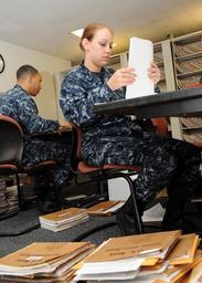 | Keywords: Balboa PSD Service Record Phase Out DVIDS304238.jpg en Seaman Alicia Drake assigned to Personnel Support Detachment Balboa works on the Navy-wide phase out of the Enlisted Field Service Records converting from paper files to electronic files Drake is part of the eight-member team who work around the clock to reach their May 31 goal of phasing out all 4 200 Enlisted Field Service Records PSD Balboa takes care of all enlisted personnel service records for Naval Medical Center San Diego USNS Mercy Naval School of Health Sciences San Diego all outlying clinics assigned to NMCSD and the Fleet Industrial Supply Center The Navy deadline is Sept 30 PSD Balboa has already phased out 1 000 records since they started May 3 2010-05-10 Petty Officer 1st Class Anastasia Puscian https //www dvidshub net/image/304238 100728-N-+++++-001 2010-07-28 16 19 SAN DIEGO CA US PD-USGov-Military-Navy USNS Mercy T-AH-19 Images from DoD uploaded by Fæ |