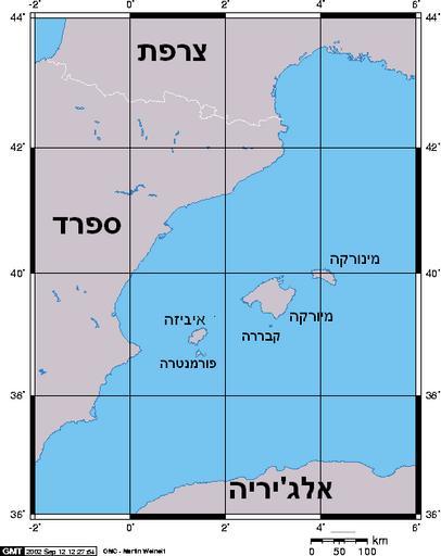 Keywords: Balearic-he.PNG Hebrew translation of the image Image Balearic png map of the Balearic Islands Own 2007-08-25 Brobdingnag Maps in Hebrew Locator maps of the Balearic Islands