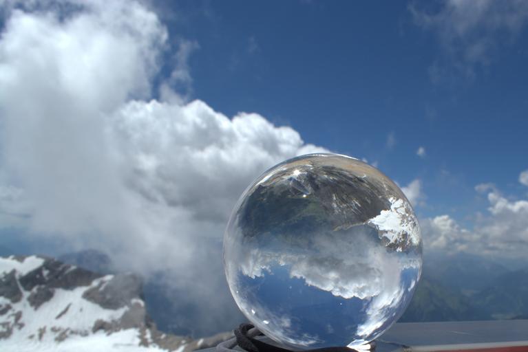 Keywords: ball glass ball globe image clouds sky mountains transparent mirroring mirrored about glass ball photo