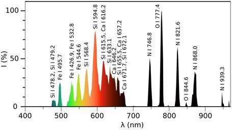 | Keywords: Ball lightning spectrum.svg en Emission spectrum of a ball lightning and annotated emission peaks of silicon iron calcium nitrogen and oxygen Vertical axis Intensity horizontal axis wavelength nm Data from Cen Jianyong; Yuan Ping; Xue Simin 17 January 2014 Observation of the Optical and Spectral Characteristics of Ball Lightning Physical Review Letters American Physical Society 112 035001 2014-01-21 14 17 08 own Olli Niemitalo cc-zero Uploaded with UploadWizard Ball lightning | ||||