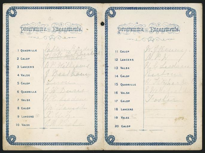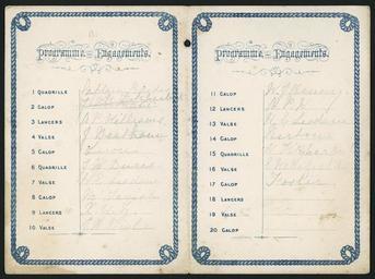 | Keywords: text document writing photo border Lists 20 dances, including waltzes, galops, lancers, quadrilles. Has an engraved border of nautical rope. Quantity: 1 colour photo-mechanical print(s) on cover of folded card programme.. Physical Description: Engraving on unfolded card, 115 x 160 mm Ball to H. R. H. Duke of Edinburgh, Wellington, April 1869. Programme [list of dances]. 1869.. [Ephemera relating to the British royal family, royal visits, anniversaries, jubilees. 1800s]. Ref: Eph-A-ROYAL-1869-01-inside. Alexander Turnbull Library, Wellington, New Zealand. natlib.govt.nz/records/22682745 Lists 20 dances, including waltzes, galops, lancers, quadrilles. Has an engraved border of nautical rope. Quantity: 1 colour photo-mechanical print(s) on cover of folded card programme.. Physical Description: Engraving on unfolded card, 115 x 160 mm Ball to H. R. H. Duke of Edinburgh, Wellington, April 1869. Programme [list of dances]. 1869.. [Ephemera relating to the British royal family, royal visits, anniversaries, jubilees. 1800s]. Ref: Eph-A-ROYAL-1869-01-inside. Alexander Turnbull Library, Wellington, New Zealand. natlib.govt.nz/records/22682745 |