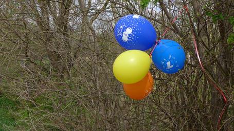 Keywords: balloons bush mark colorful yellow orange blue white brown note announcement characters