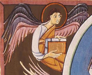 Keywords: BambergApocalypseFolio010vWorshipBeforeThroneOfGod-DetailAngel.jpg Der Engel als Symbol für den Evangelisten Matthäus The Angel Bamberger Apokalypse Folio 10 verso Bamberg Staatsbibliothek MS A II 42 Folio 10 verso del Apocalipsis de Bamberg um 1000 Auftraggeber Otto III oder Heinrich II Author died more than 70 years ago - public domain PD-old Bamberg Apocalypse Angel of Saint Matthew in miniatures Angels with books |