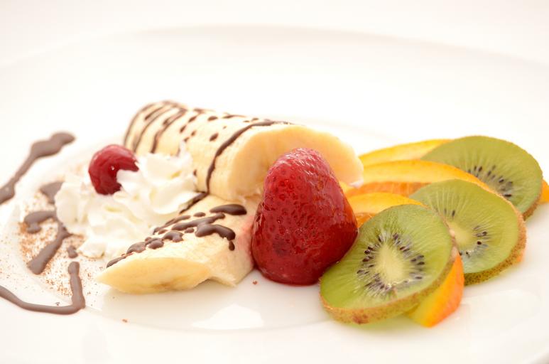 Keywords: bananas strawberries kiwi orange dessert ice cream fruit sweets whipped cream eating sweet dish the sweetness chocolate sweet pastries cocoa tube