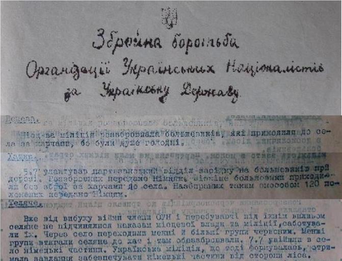 | Keywords: BanderaOUNPeoplemilitiareport1941c.jpg  en Bandera's OUN Peoples militia reports CDAVO f 3833 l 2 f 32 pp 1-11 own copy image copy byJo0doe 1941-07 s 1940 Text In Ukrainian Title handwriting Зб ойна бо отьба О ганізації Ук аїнськиї націоналістів за Ук аїнську Де жаву typed text В Б енева  ісцева міліція  оззб оювала більшовиків які п иходили до села за ха чами бо були дуже голодні Хатьки 5 7 улаштував па тизанський відділ засідку на більшовиків засідку п и до озі Роззб оєних пе едано німцям Пізніше більшовики п иходили без зб ої за ха чами до села  азби аних таким способом 120 полонених було пе едано німцям Теляче Вже від вибуху війни члени ОУ і пе ебуваючі під їхнім впливом селяне не підчинялися наказам місцевої влади та міліції саботували їх Че ез село п оходили менші й більші г упи че воних  еньші г упи втягали селяне до хат і там обеззб оювали 7 7 увійшли в село німецьки частини Ук аїнська міліція що тоді фо мувалась от имала завдання забезпечувати німецькі частини від сто они ліса cc-by-sa-3 0 GFDL Bandera's OUN Ukrainian People's Militia |