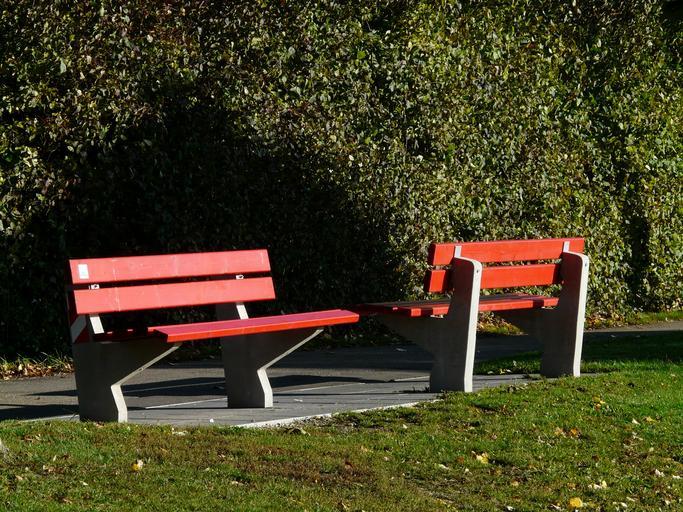 Keywords: bank park bench park seat sit cozy rest red painted recovery