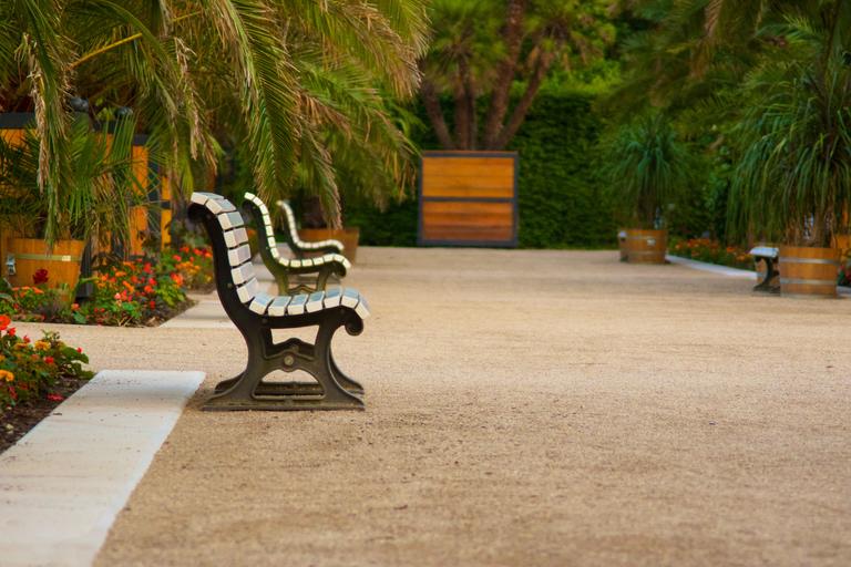 Keywords: bank park benches plant rest palm trees idyllic silent