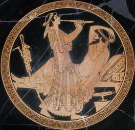 Keywords: Banquet scene Louvre G135 full.jpg Banqueter and musician kalos inscription Ho pais kalos The boy is handsome Tondo from an Attic red-figure cup ca 490 BC Found in Vulci Banqueteur et un musicien inscription kalos Ho pais kalos Le garcon est beau Tondo d'une coupe attique à figures rouges v 480 av J -C Provenance Vulci Diam 32 cm 12 ½ in Museum Louvre Department of Greek Etruscan and Roman Antiquities Sully room 43 case 4 Beazley Attic Red-figured Vase-Painters 1963 355 45 object history credit line Canino Collection 1848 accession number G 135 Jastrow 2008 other versions <gallery> Image Banquet scene Louvre G135 jpg </gallery> Auloi in ancient Greek pottery Kylixes in art Greek antiquities in the Louvre - Room 43 Colmar Painter Hetaeras at symposium in ancient Greek pottery Canino Collection Kylix interiors Kalos inscriptions 480s BC pottery Meanders in ancient Greek pottery |