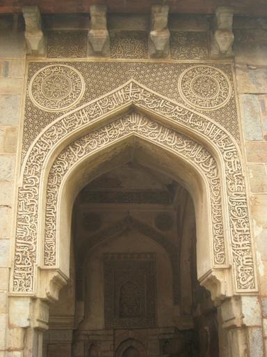 | Keywords: Bara Gumbad mosque -9.JPG Arabic calligraphy on arch at the Bara Gumbad mosque in Lodi Gardens at dawn New Delhi India I took this photograph 2010-09-03 Daderot Bara Gumbad mosque Islamic arches Arches in India Arabic calligraphy in applied art |